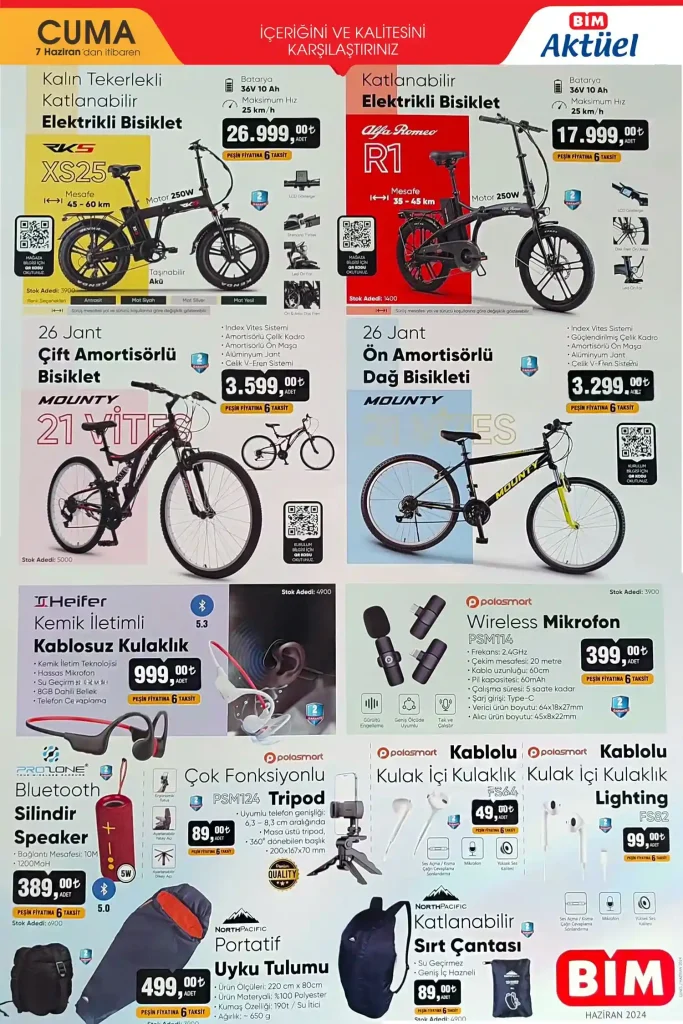 Elektrikli bisikletler de BİM’in 7 Haziran 2024 kataloğunda önemli bir yer tutuyor. RKS Kalın Tekerlekli Katlanabilir Elektrik Bisikleti XS25 26.999,00 TL Alfa Romeo Katlanabilir Elektrik Bisikleti R1 ise 17.999,00 TL fiyatla satışa sunulacak. Elektrikli olmayan bisikletler arasında ise Mounty ve Ön Amortisörlü Dağ Bisikletleri uygun fiyatlarıyla dikkat çekiyor.