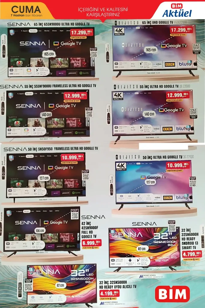 Televizyon kategorisinde Senna ve Dijitsu markalarıyla öne çıkan ürünler Google TV Smart 4K Ultra HD özellikleriyle satışa sunuluyor. İlk olarak Senna’nın 65 inçlik modeli 17.299,00 TL fiyatla ardından Dijitsu’nun benzer özelliklere sahip 65 inçlik modeliyle aynı fiyatta raflarda yerini alacak. Daha kompakt boyutlarda olan 55 inçlik ve 50 inçlik modeller de 12.999,00 TL ve 10.999,00 TL fiyatlarla tüketicilerle buluşacak.
