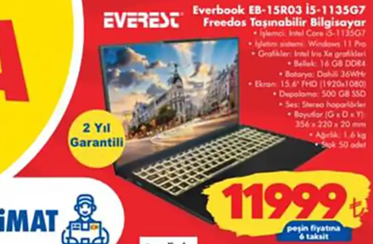 Everest EB-15R03 i5-1135g7 Taşınabilir Bilgisayar uygun fiyatı ve yüksek performans sunan özellikleriyle son zamanlarda piyasada oldukça fazla dikkat çekiyor. Uygun fiyatlı leptop almak isteyen birçok kişi leptopun özelliklerini ve kullanıcı yorumlarını merak ederken, alınıp alınmayacağını internet üzerinden araştııyor. Gençlerin daha çok tercih edeceği ürün yakın zamanda ŞOK marketlerdeki yerini alacak. 25 Kasım ŞOK Aktüel kataloğunda duyurulan bilgisayar, leptop ihtiyacı olan birçok kişinin dikkatini çekmiş durumda.