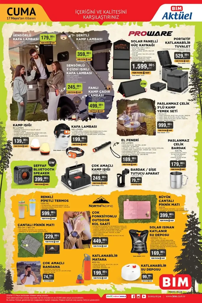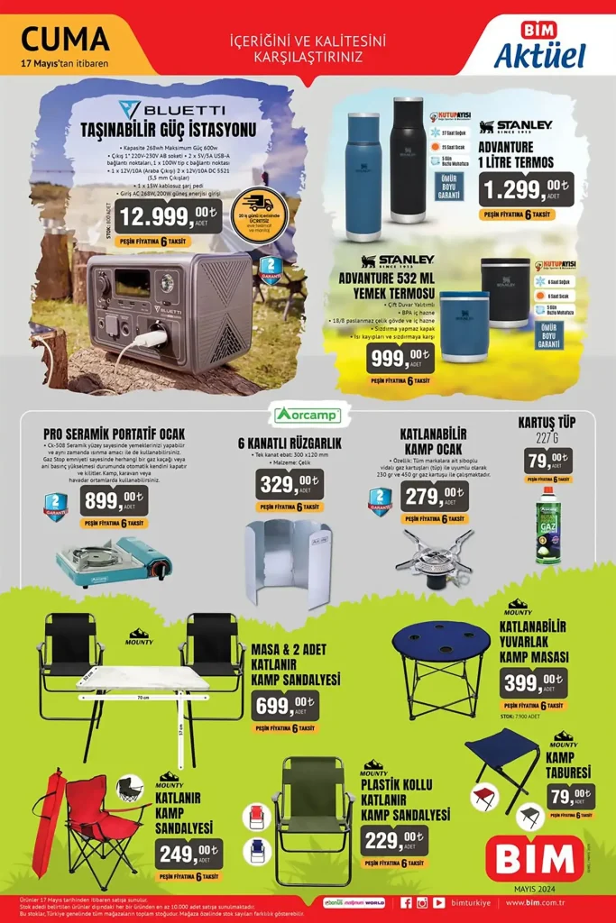 Bim marketlerden yepyeni bir aktüel ürünler kataloğu duyuruldu. Uygun fiyatlarla market alışverişi yapmak isteyen müşterilerin tercih ettiği Bim marketlerde bu defa kamp eşyaları peşin fiyatına 6 taksitle satışa çıkartıldı. Stanley termos, taşınabilir güç istasyonu, katlanabilir kamp sandalyesi, katlanabilir tuvalet, güç kaynağı, üçlü kamp yemek set, ışık gibi ürünler almak isteyen vatandaşlar en yakın Bim market şubesine uğrayabilir. Bunların yanı sıra pijama, eşofman takımı, saat, kilim gibi ürünler de Bim 17 Mayıs 2024 aktüel kataloğunda satışta olacak.