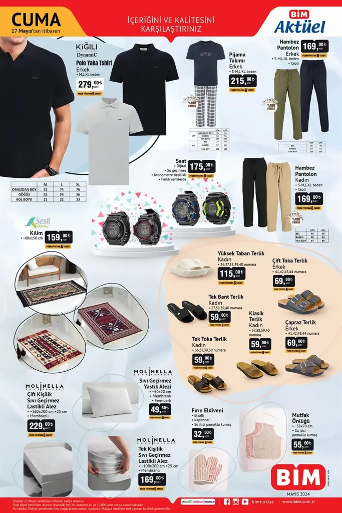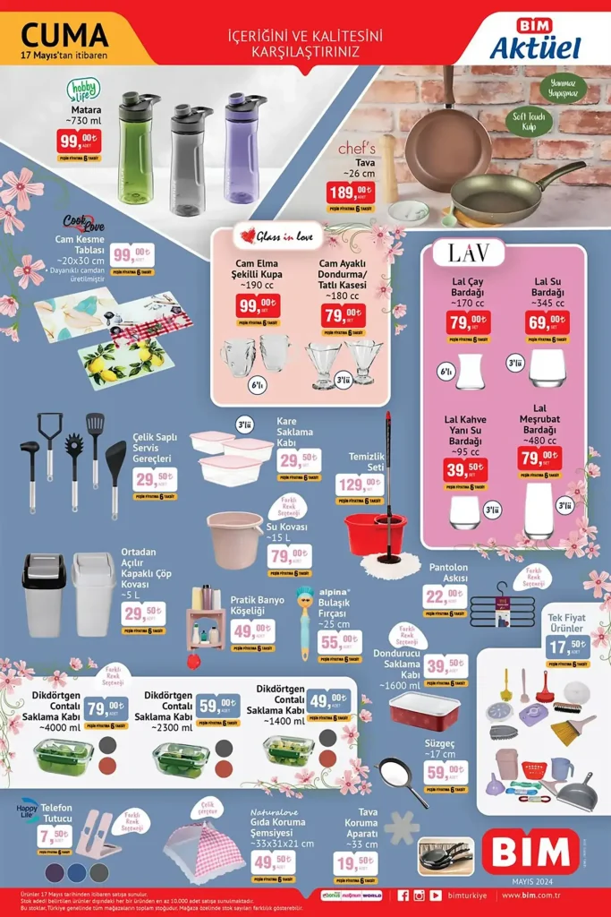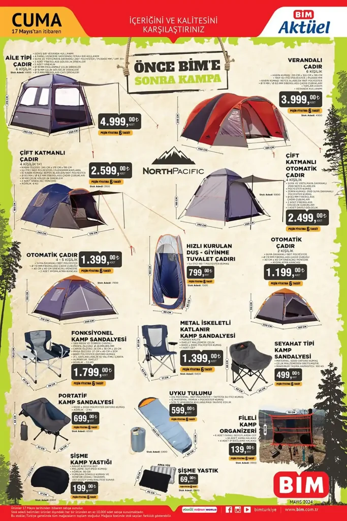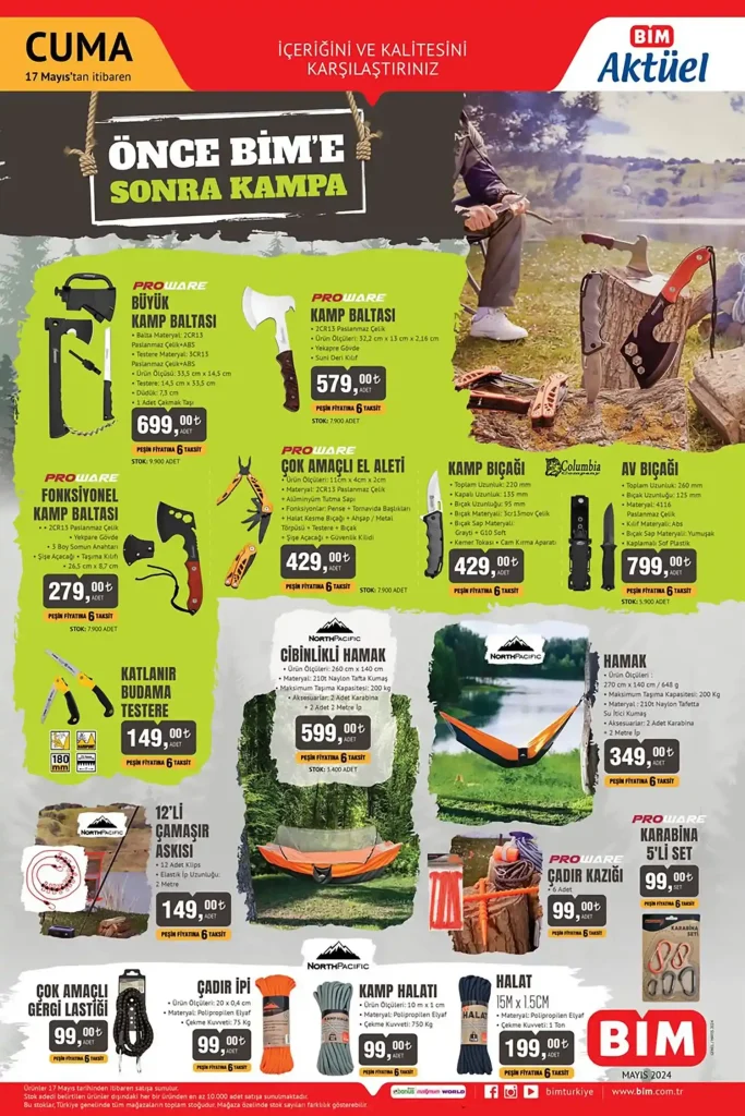 Uygun fiyatlarla Bim marketlerden alışveriş yapmak isteyen vatandaşların yüzlerini güldürecek yepyeni bir aktüel kataloğu duyuruldu. Özellikle son dönemlerde yaz aylarının vazgeçilmezi olan kamp yapmak için pek çok eşya uygun fiyatlardan Bim marketlerde satışa çıkartıldı. Kamp eşyalarının yanı sıra terlik, sıvı geçirmez yastık alezi, mutfak önlüğü, klim, saat, eşofman, pijama takımı, tişört gibi bir ürünler de bir marketlerde satışta. İşte Bim 17 Mayıs aktüel ürünler kataloğu…